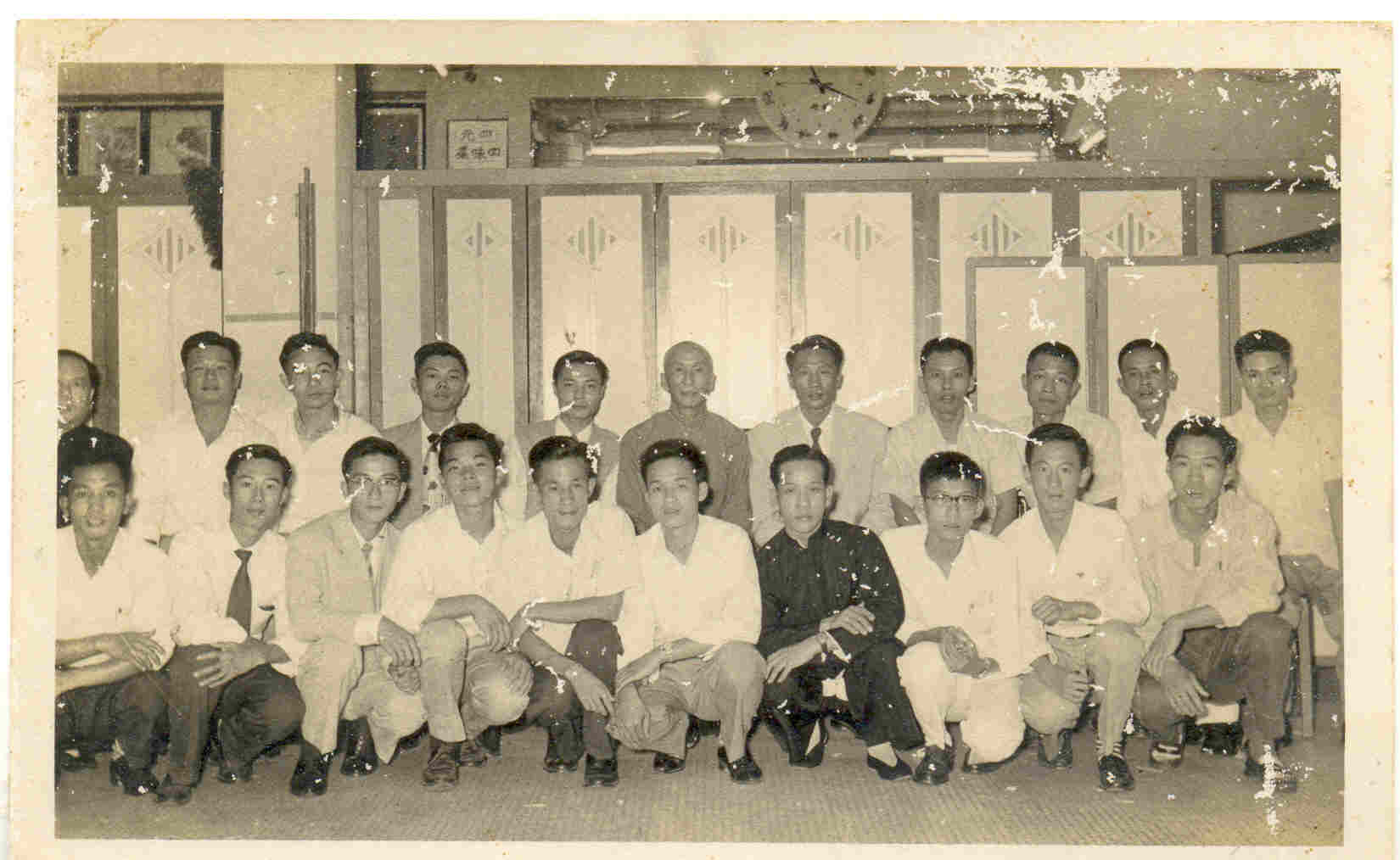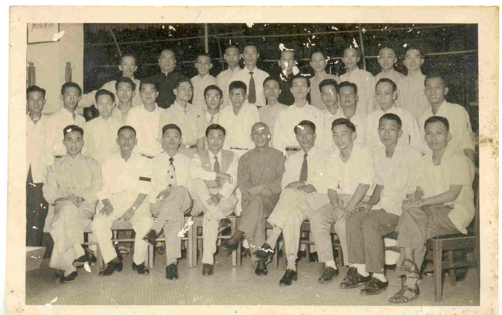 前右 葉問宗師, 前左 羅炳師傅, 右起 羅在達, 鄧木燦,石清,鄧群英,羅少華,鄧芝杏,范錫,胡定,余寿邦.
